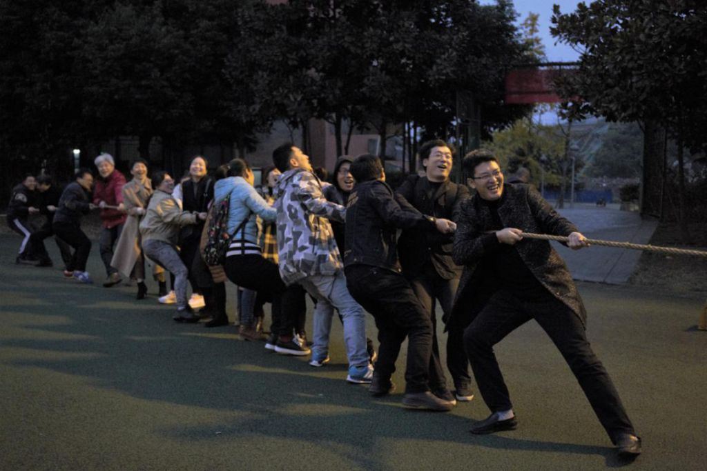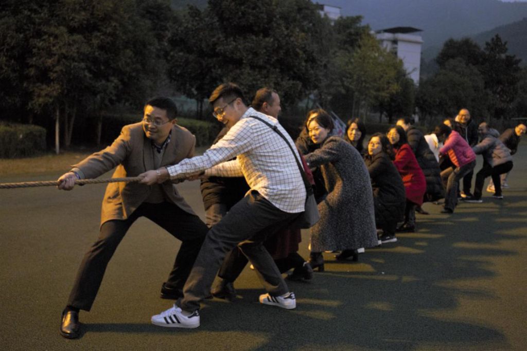 比赛中,双方老师秉承“友谊第一,比赛第二”的原则,开展活动井然有序。萧瑟寒风中,老师们精神振奋,开始一场针锋相对的比赛。他们紧紧地抓住绳子,眼睛盯着前方,脚用力地抵着地面,身子向后倾斜着,使出浑身解数,向自己的方向拽绳子。在双方激烈的比拼下,第二组老师最终获得胜利。