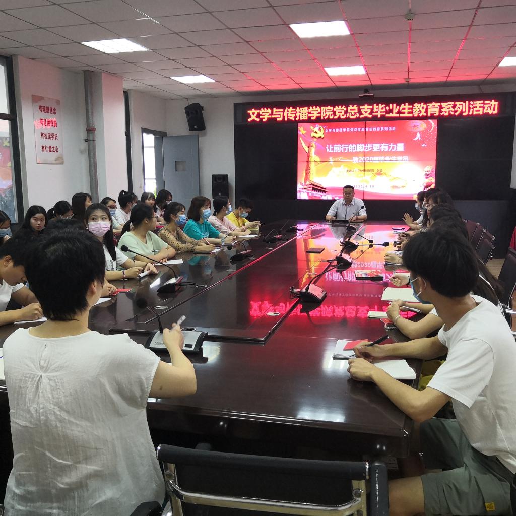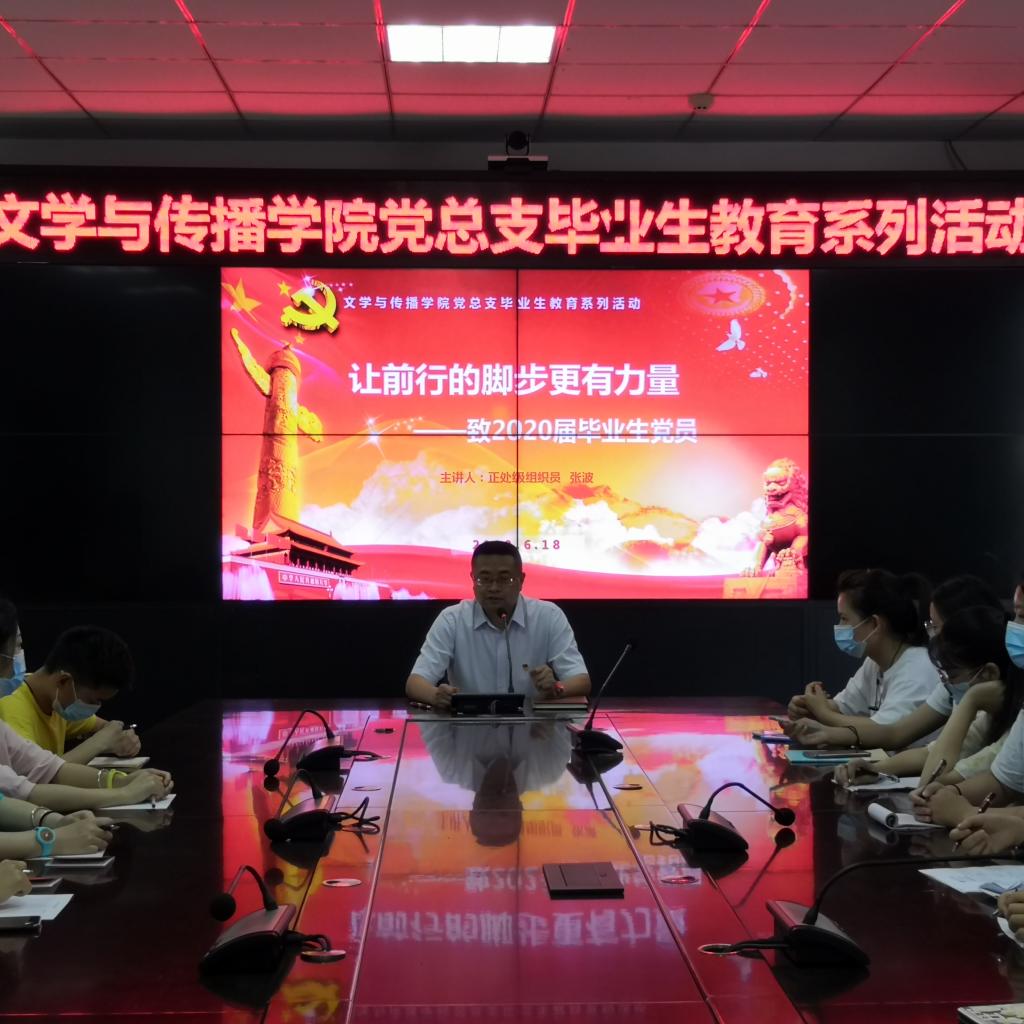 2020年6月18日,文学与传播公司党总支开展毕业生党员教育活动,正处级组织员张波老师为毕业生党员上题为《让前行的脚步更有力量——致2020届毕业生党员》的最后一课。党总支副书记王文娟主持。
