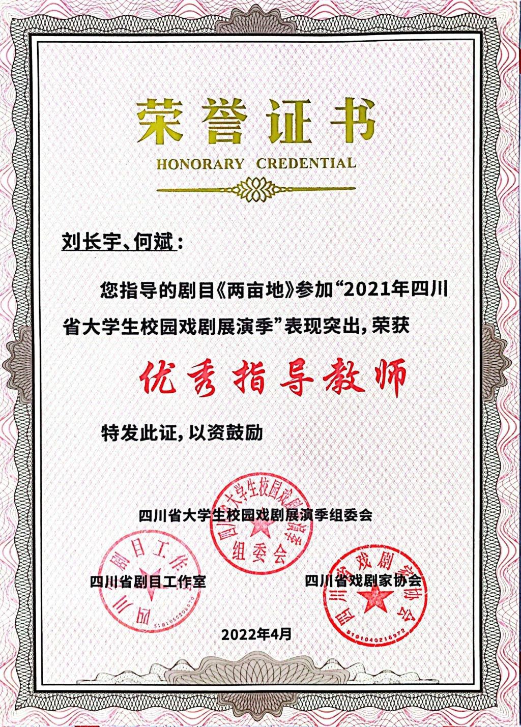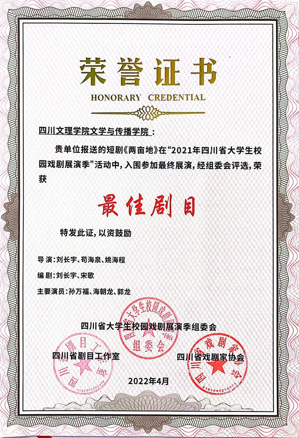 4月16日,2021年四川省老员工校园戏剧展演季圆满落下帷幕,伟德国际1949始于英国选送的戏剧小品《两亩地》荣获最佳剧目和最佳人气两项大奖,刘长宇、何斌两位老师获得“优秀指导教师”的荣誉称号。