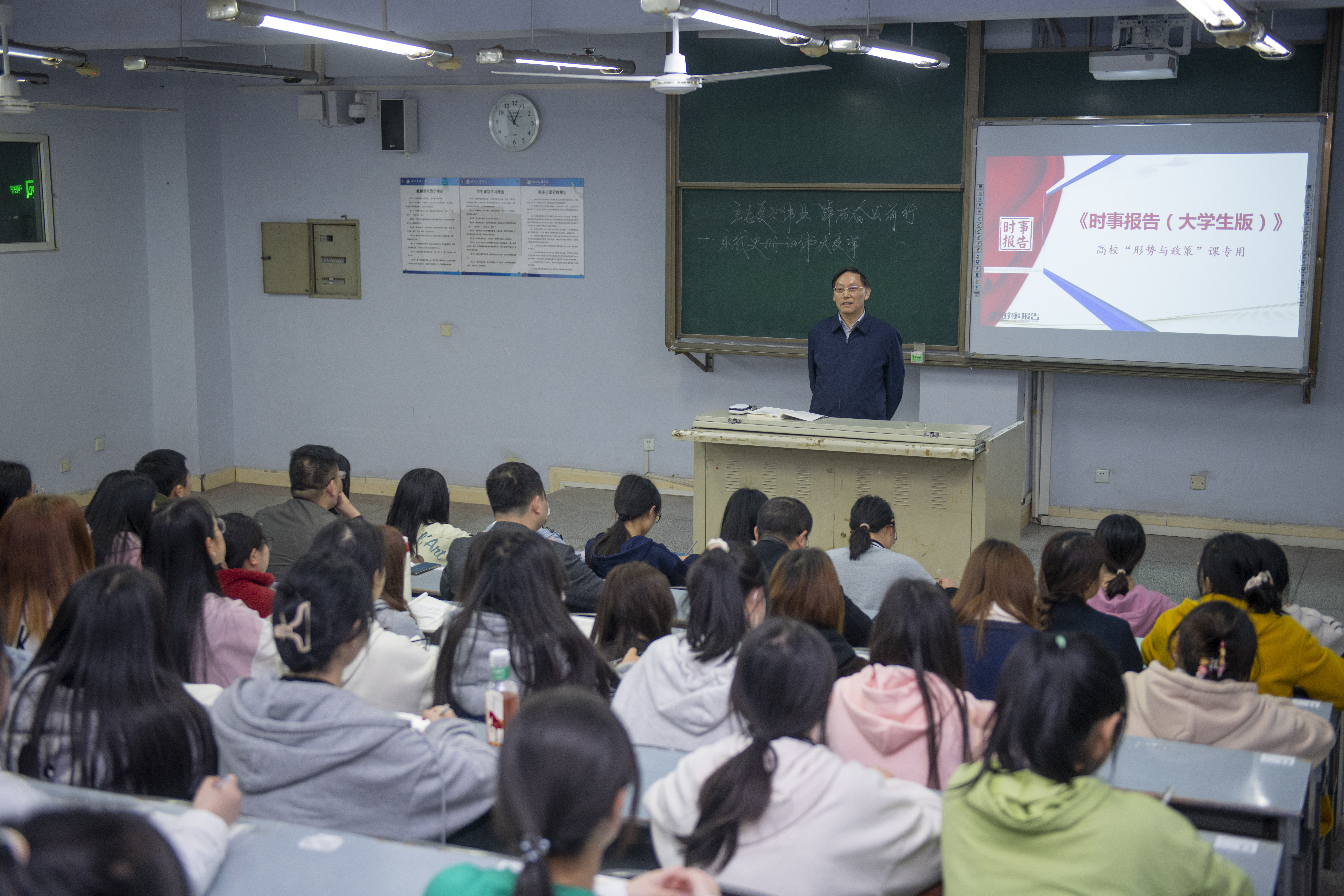 王成端教授以“永载史册的伟大变革、引领复兴的宏伟蓝图及笃行不怠的战略定力”三个方面作为授课的主要内容。以党的二十大报告为切入点,通过“百秒说·非凡十年”视频,引用大量详实的数据和图片,将理论与实践结合,从历史和现实、国际和国内多个维度,旁征博引,让同学们清楚认识我们党在新时代十年伟大变革中取得的伟大成就,在新时代的伟大奋斗中中国人民焕发出的历史自觉和主动精神,并强调了“两个确立”具有的决定性意义。