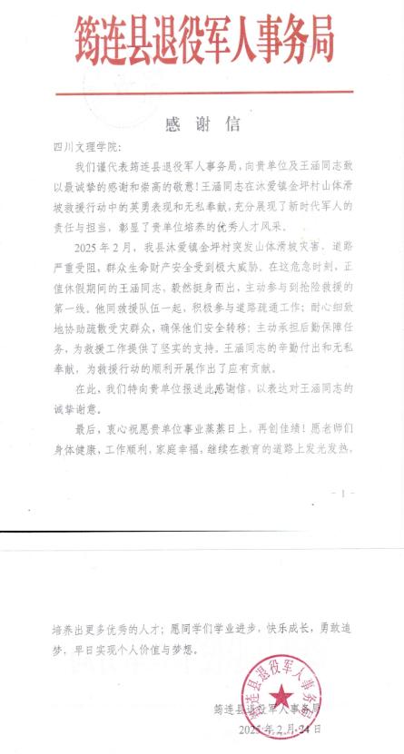2月24日,宜宾市筠连县退役军人事务局向公司发来一封感谢信,高度赞扬公司王涵同学在2月沐爱镇金坪村山体滑坡救援中的突出表现。