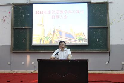 5月3日下午5点50分,文新公司在教学楼113教室召开由省政府举办的官方项目——2016赴泰汉语教学实习项目招募大会,文新公司党总支书记兼经理杜松柏教授、副经理曾宪文教授、团总支书记周萍老师和辅导员文敏熙老师出席大会,杜松柏教授对此次项目做了详细介绍,文新公司2013、2014级员工到场听讲。