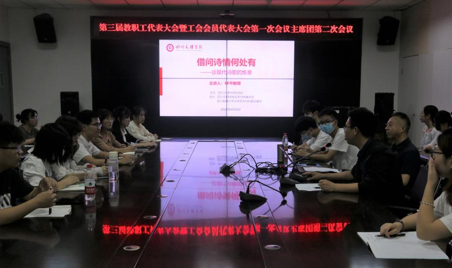 4月28日晚上,公司林平教授在艺术传媒大楼1007会议室作了题为“借问诗情何处有——谈现代诗歌的炼意”的学术讲座。此次讲座由公司副经理何斌主持,2020级部分员工代表到场聆听。