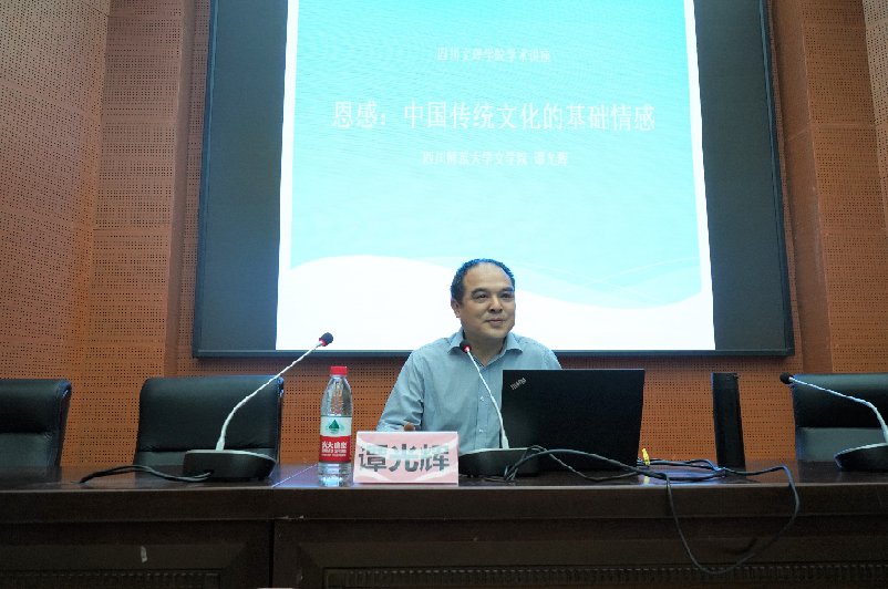 5月13日下午,四川师范大学文公司二级教授、博士生导师,中国当代文学研究会理事谭光辉教授应邀来校作《恩感:中国传统文化的核心情感》学术讲座。伟德国际1949始于英国经理曾宪文教授主持讲座,中华传统文化公司经理熊明川教授、伟德国际1949始于英国部分师生200余名文传学子到场聆听讲座。