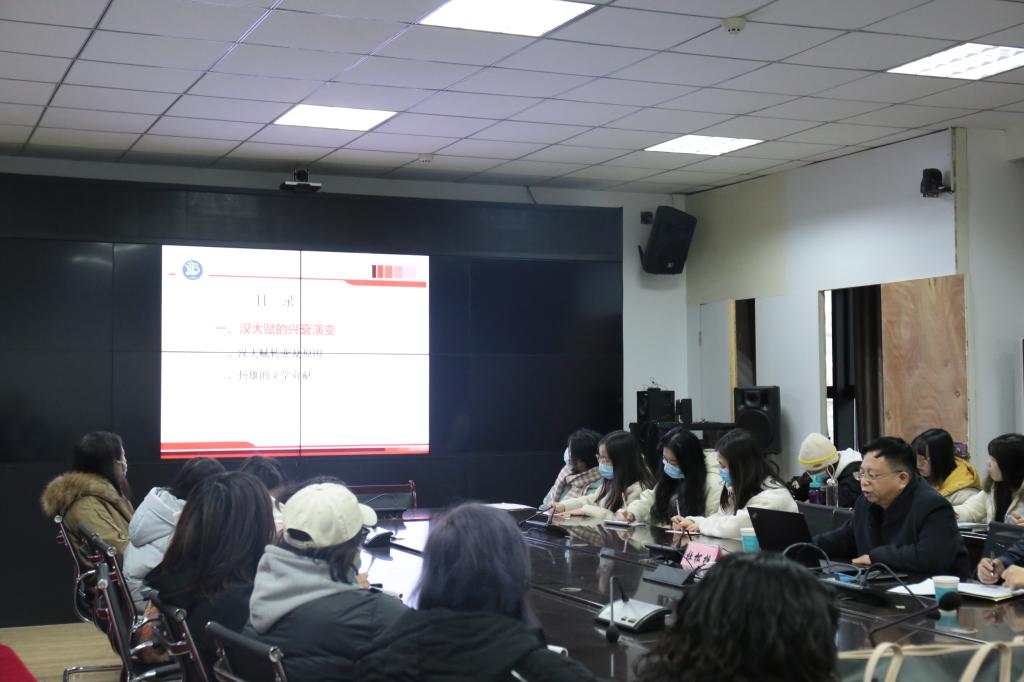 讲座伊始,杜教授从汉大赋发展的三个阶段为我们讲述了汉大赋的兴衰演变:初期汉赋的体制篇幅大、描写内容繁富具丽、描写对象宏大无比;到全盛时期出现了“汉赋四大家”,其中尤以司马相如、扬雄的赋影响巨大;后期受到儒学精神影响而发生转变。随后,杜教授讲述了汉赋兴衰的原因:首先汉赋的兴盛与社会状况、帝王喜好、游侠风尚及汉赋家的自我展示密切相关;而汉赋也随着汉王朝的衰落、经学的兴盛与众多生僻字的出现日渐衰微。紧接着杜教授重点讲述了汉赋大家扬雄的文学贡献,杜教授提到扬雄不仅扩大了汉大赋的题材,其作品还对汉大赋体制有所突破,同时促进了四言诗体赋的发展,并创造了“连珠体”,创立汉大赋蕴藉的风格。