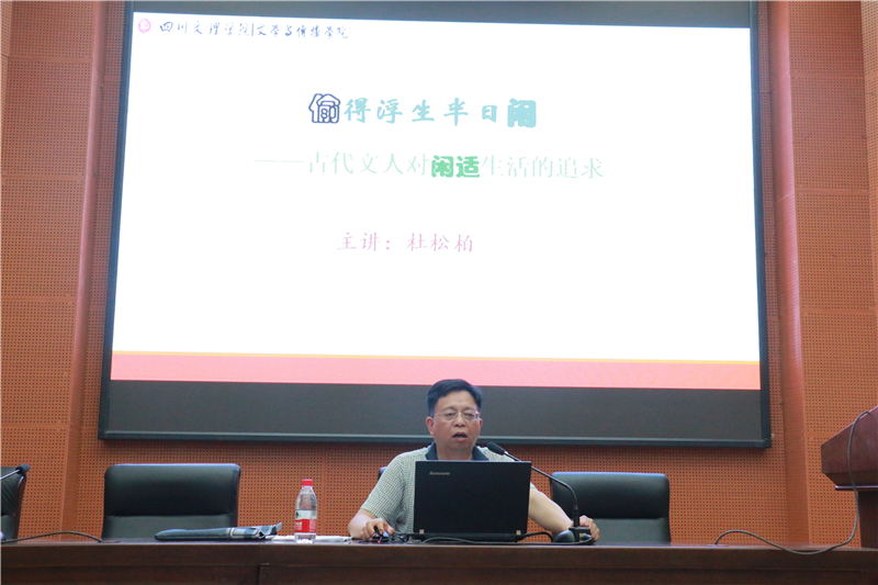 讲座伊始,杜松柏教授用三段论的方式,梳理了古代文人对闲适生活追求的观点。杜教授从闲适的美学特征、古代文人对闲适的追求、现实意义三大方面分析入手,展开了对中国古代文人闲适精神的讲述,并详细解读了闲适的含义与由来。杜教授讲到,“闲”是中华民族先民审美心态的鲜明特质,面对恶劣的自然环境,先民们具有“不以物喜,不以己悲”的文化素质和“优哉游哉”的生活情调,指出这表达了与天地相交流、与日月共作息的自然观和生命观;忙中有闲、弛张适度的生活节奏和生活情调;对君王、权力的蔑视和高度自信的处世态度。另一方面,杜松柏教授在谈到“闲” 时,举出其反例“忙”,阐明“忙”本义“惊异”“惊恐”,引申为“忙碌”。从哲学美学方面看,“忙”体现出阳刚之美;“闲”体现阴柔之美。同时,杜教授鼓励同学们学会经营自己的人生,在确定自己的奋斗目标后,合理安排学习与娱乐时间,真正做到劳逸结合。