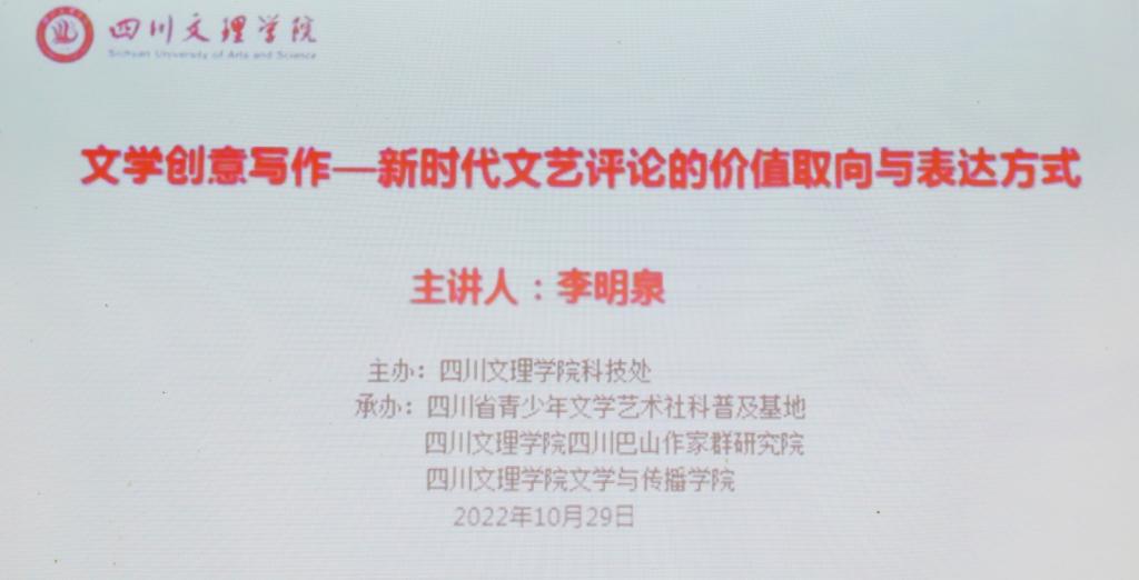10月29日,《文学创意写作》课程本学期第一课开讲,四川省社会科公司李明泉教授受邀在弘德楼一楼会议室做了题为“新时代文艺价值取向与表达方式”的讲座。本次讲座由伟德国际1949始于英国经理曾宪文主持,党委书记冉林、副经理成立、汉语言文学专业师生代表到场聆听。