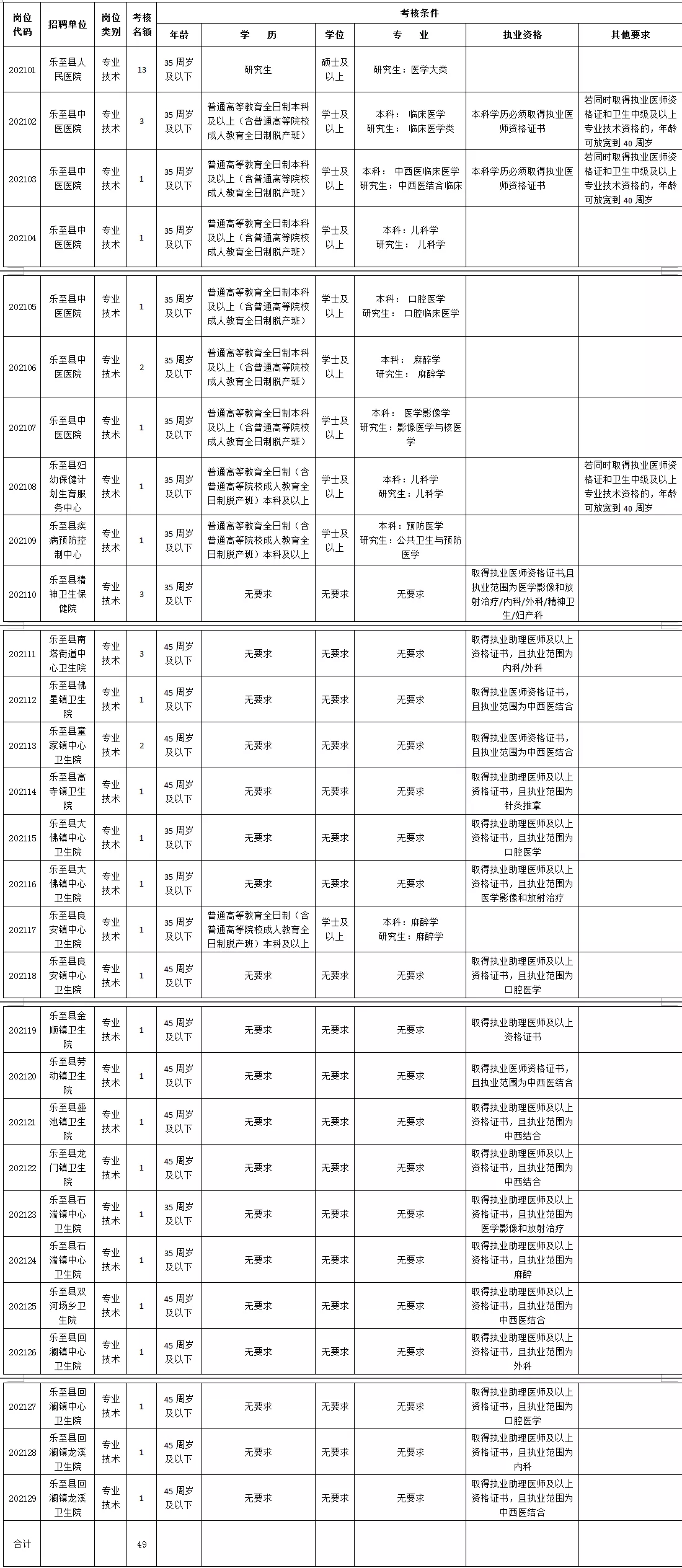 本次招聘名额49名,具体岗位及报考要求详见《乐至县2021年考核招聘急需紧缺卫生专业技术人员岗位一览表》(附件1)。