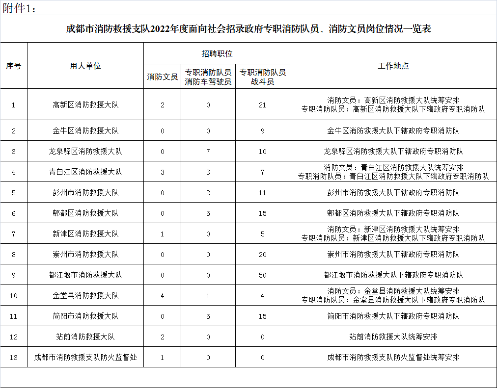 政府专职消防队员考核分片区集中考核:郫都、彭州、青白江、金堂、都江堰应聘人员集中至彭州市消防救援大队参加考核;崇州、金牛、简阳、新津、高新、龙泉应聘人员集中至龙泉驿区消防救援大队参加考核。消防文员招录考核工作由用人单位按有关规定组织实施。