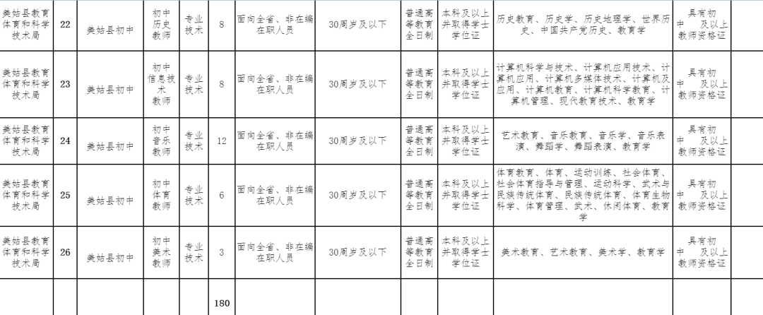本次公开考核招聘初、高中教师180名,详细情况见附件《美姑县2022年上半年公开考核招聘初高中学教师岗位和条件要求一览表、岗位安排表》(以下简称《一览表》)。