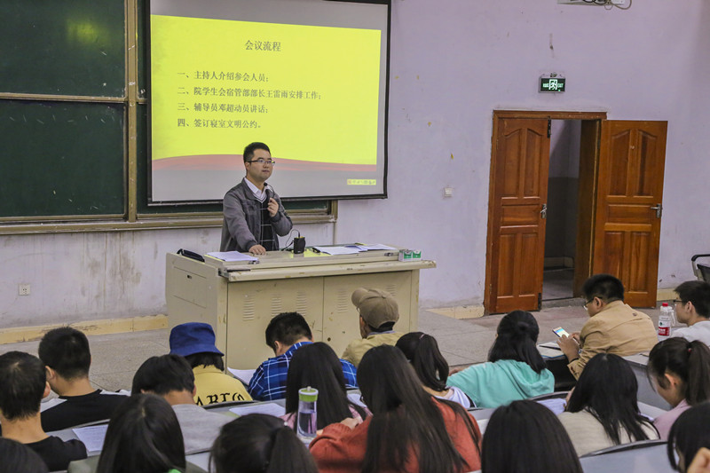 在大会上,邓超老师向同学详细介绍了此次会议内容:寝室内务、安全隐患、各项检查条例要求以及签订寝室文明公约等。他强调,寝室是同学们在公司的家,每位同学都有责任和义务管理寝室卫生。随后,宿管部部长王雷雨、副部长杨轲茗、包世鹏分别对寝室内的各项要求、寝室内务、以及对晚归同学的查处、寝室安全隐患等问题作出详细说明。邓超老师也通过展示寝室内务卫生等照片进行对比,对良好卫生寝室和较差卫生寝室分别作了赞扬和批评,进一步讲明寝室卫生与我们身体健康的切实关系,将卫生环境差的危害落实到我们生活的方方方面。在寝室安全隐患方面,邓老师选取真实事件案列并结合寝室使用大功率电器所带来的弊端给同学们深刻讲解,同时就公司近期寝室工作作出相关部署。