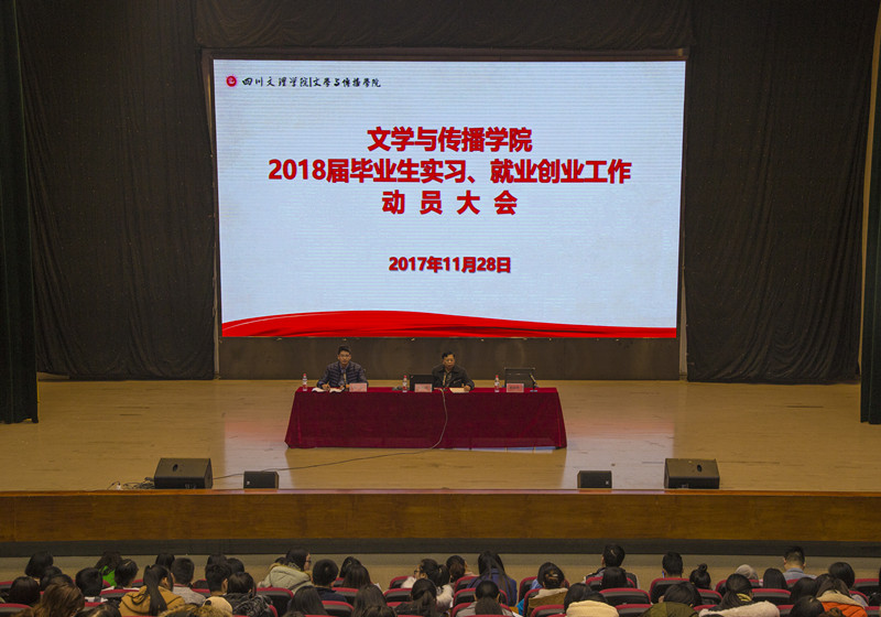 11月28日下午5:30,公司在艺术传媒大楼多功能厅成功召开了“2018届毕业生实习、就业创业工作动员”大会。本次大会由公司党总支副书记张桢老师主持,公司经理杜松柏教授、各教研室主任、各毕业班班主任以及辅导员邓超、文敏熙、孙琪老师出席此次动员大会,2018届毕业班全体员工参与动员大会。