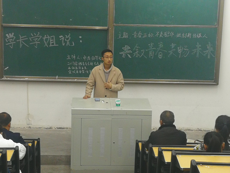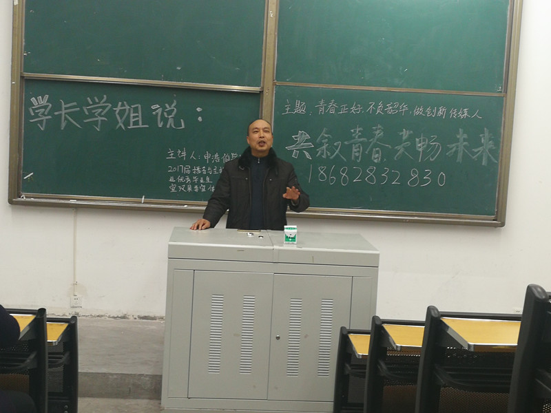 为了使大家更好的规划老员工活,更快的了解社会, 11月18日晚,2018级播音与主持艺术专业三个班级在艺术传媒楼1029教室共同举办了“学长学姐说”主题班会,本期做客的嘉宾是2017届播音与主持专业优秀毕业生、宣汉县委宣传部申浩伯学长,他就“青春正好,不负韶华,做创新型传媒人”与同学们进行了交流,文学与传播公司党总支书记赵定贵教授、辅导员尚亮老师参加班会,会议由辅导员彭娜老师主持。