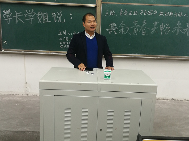 会上,浩伯学长首先感谢母校和公司老师的栽培,毕业一年,看到母校变化他由衷的感到高兴。随后,同大家回忆起了自己在文理校园的青春岁月,就自己在校时候的专业晨练、在员工干部岗位的锻炼、如何备考公务员以及工作后的为人处世之道等详细进行了讲述。他说,做新时代的传媒人,在公司里要严格自律,和班级以及寝室同学要相互尊重;在专业上要打牢基础、积极参与各项活动,善于创新;在员工干部工作上要勤于思考、懂得观察、敢于担当;他还讲述了自己工作后,更加懂得语言表达的力量,好的口才为工作锦上添花。最后学长说,大学是一个广阔的平台,要充分的认清自己的目标,尽快找准自己的定位,不局限于专业本身,不虚度不荒废光阴,做大做强自己,拥抱灿烂青春。