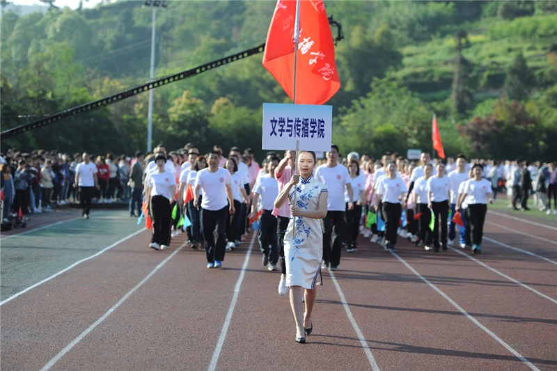 运动会开幕式上,公司师生代表、运动员代表身着白色或粉色T恤组成方队,在公司经理杜松柏老师、党总支副书记兼副经理张桢老师、副经理彭金祥老师的带领下整齐前进,“文传文传,器宇非凡,信笃志坚,奋勇争先。”的口号响彻田径场上空。