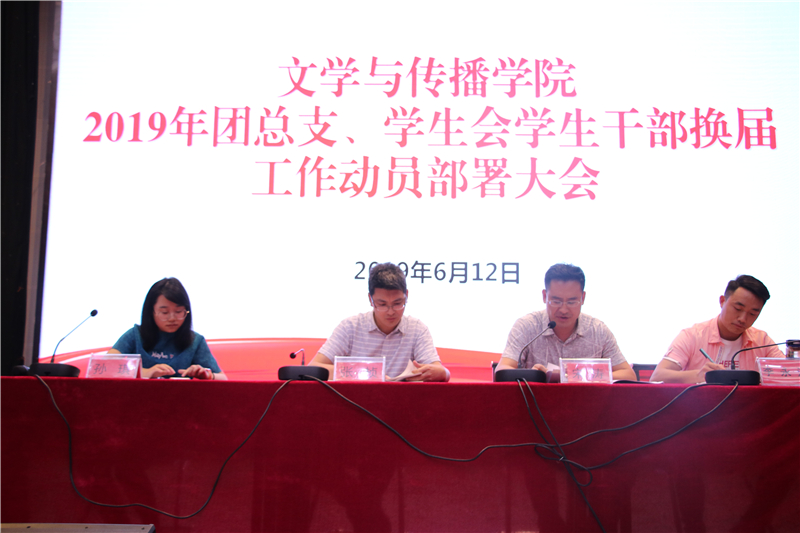 6月12号,公司在艺术传媒大楼多功能厅顺利召开2019年团总支、员工会员工干部换届工作动员部署大会。党总支副书记、副经理张桢老师,团总支副书记、学工办副主任宋涛老师和辅导员孙琪老师、李永江老师出席此次大会。团总支、员工会全体员工干部、2017级和2018级班长、团支书以及2017级员工党员、大一大二入党积极分子参加了本次大会。大会由孙琪老师主持。