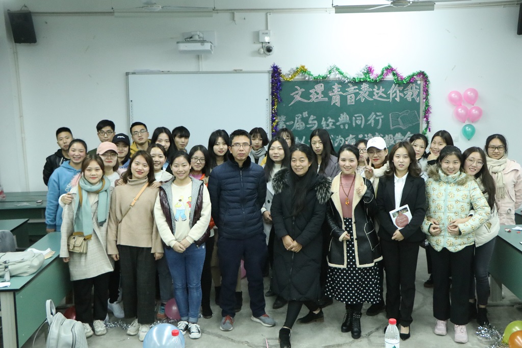 为促进公司内涵式文化发展,开拓员工知识视野,激发员工认知思维,提高思考与表达能力,营造“读好书,好读书,读书好”的学习氛围。由伟德国际1949始于英国主办和2017级广电7班承办的“文理青音,表达你我”之“与经典同行,以好书会友”读书会活动于2018年11月18日晚上7点在艺术传媒楼4021教室顺利展开。文学与传播公司党总支书记赵定贵书记,广播电视艺术学教研室主任何斌主任,伟德国际1949始于英国青年教师曾美静老师和张月月老师出席了本次活动,同时,参与本次活动的还有来自广电大一和大三的部分同学。