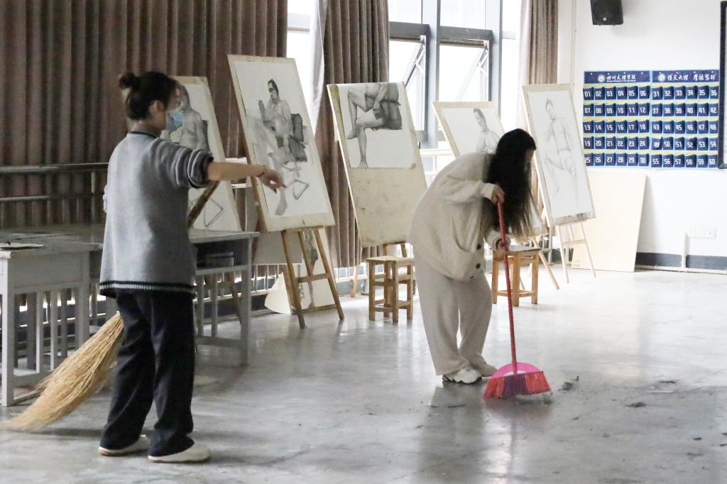 宿舍内,其余同学积极整理床铺、清洁地面、擦拭衣橱,为让寝室变得整洁而努力。老师们走进宿舍楼,与员工交流劳动心得,针对卫生死角,为同学们做出示范。同学们纷纷表示,通过对宿舍进行打扫,感受到了劳动的乐趣,今后也会养成热爱劳动的好习惯。