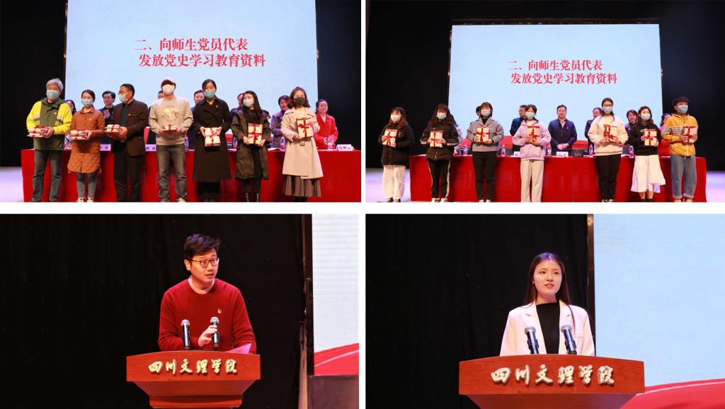 会上还向师生党员代表发放党史学习教育资料并展开集中学习教育,师生党员代表分别作表态发言。